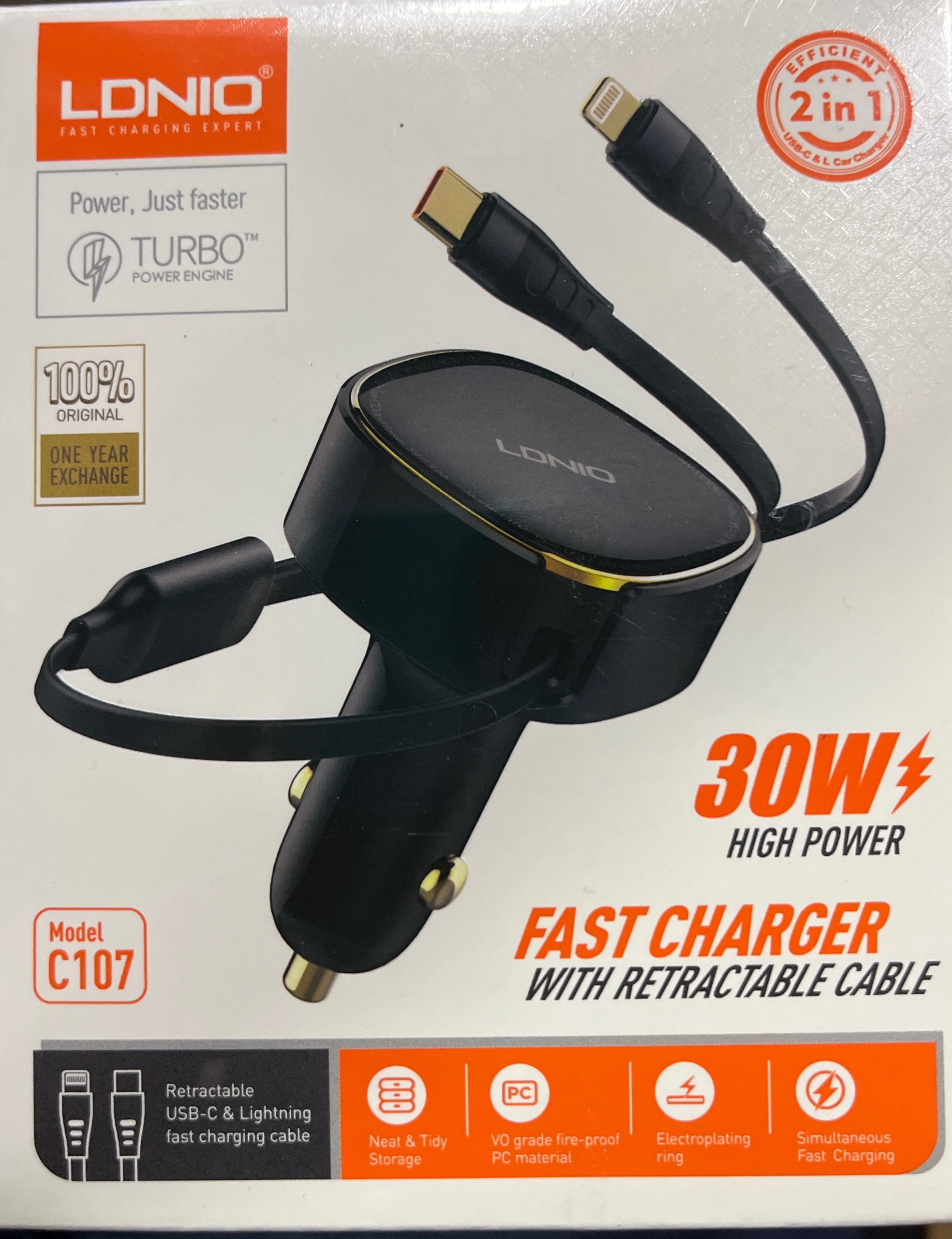 CARGADOR VEHICULAR 30W LDNIO C107 2IN1 RETRÁCTIL